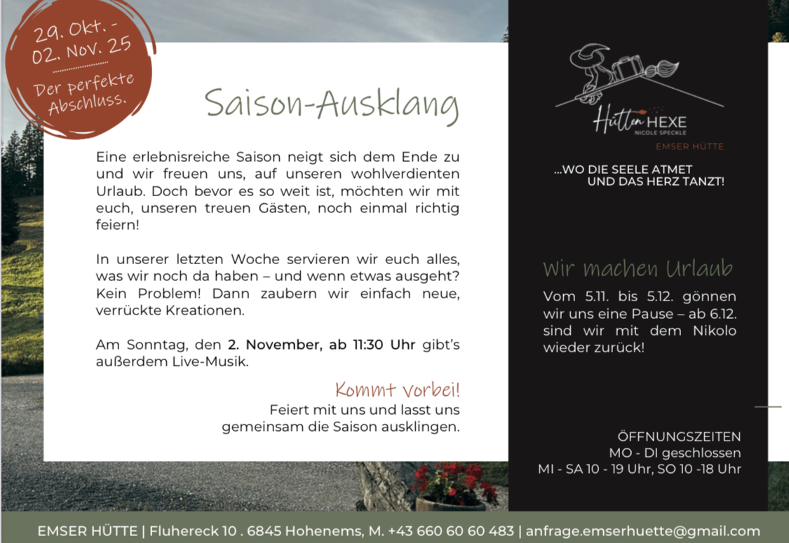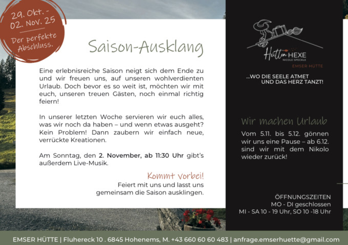 Die nächstgelegene Hütte ist das NF Götzner Haus in 1.298 m, das in 1 h Gehzeit zu erreichen ist.Gipfelbesteigungen von der Emser Hütte aus: Hohe Kugel (1.645 m, 1 h), Fraxner Firstkammm/Vorderhörnle (1.656 m, 2:30 h), Hoher Freschen (2.004 m, 3:30 h), herrlich auch die Wanderung über die Alpe Schöner Mann und die Besteigung des Schönen Mannes, Abstieg nach Schuttannen mit Bodenseeblick.